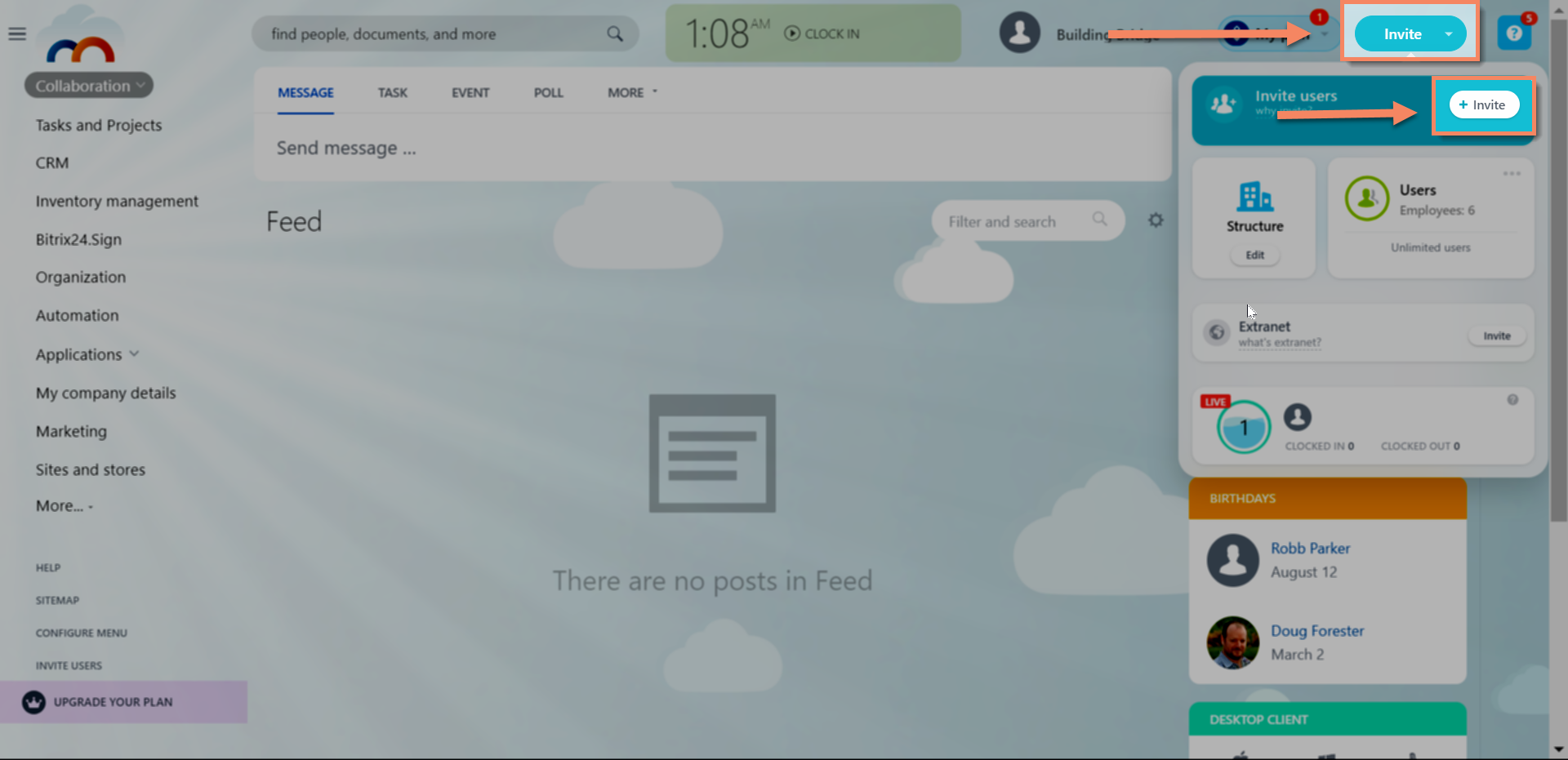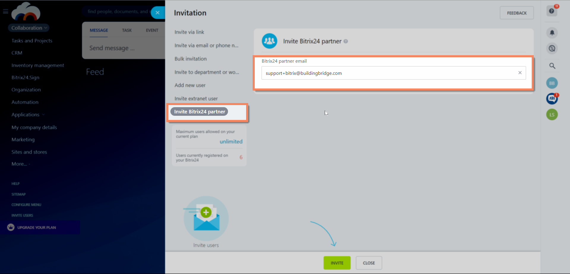 2 Invite Building Bridge Click "Invite Bitrix24 Partner" from the left-hand menu. Enter "support+bitrix@buildingbridge.com" as the Bitrix24 partner email.Click "Invite" at the bottom.
